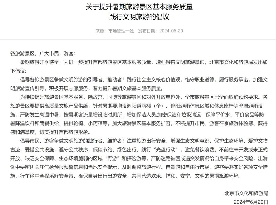 北京市文化和旅游局日前通过官方网站发出《关于提升暑期旅游景区基本服务质量 践行文明旅游的倡议》。倡议中提到:为持续提升旅游景区基本服务,除故宫、国博等旅游景区和对外开放单位外,全市旅游景区已全面取消预约要求。