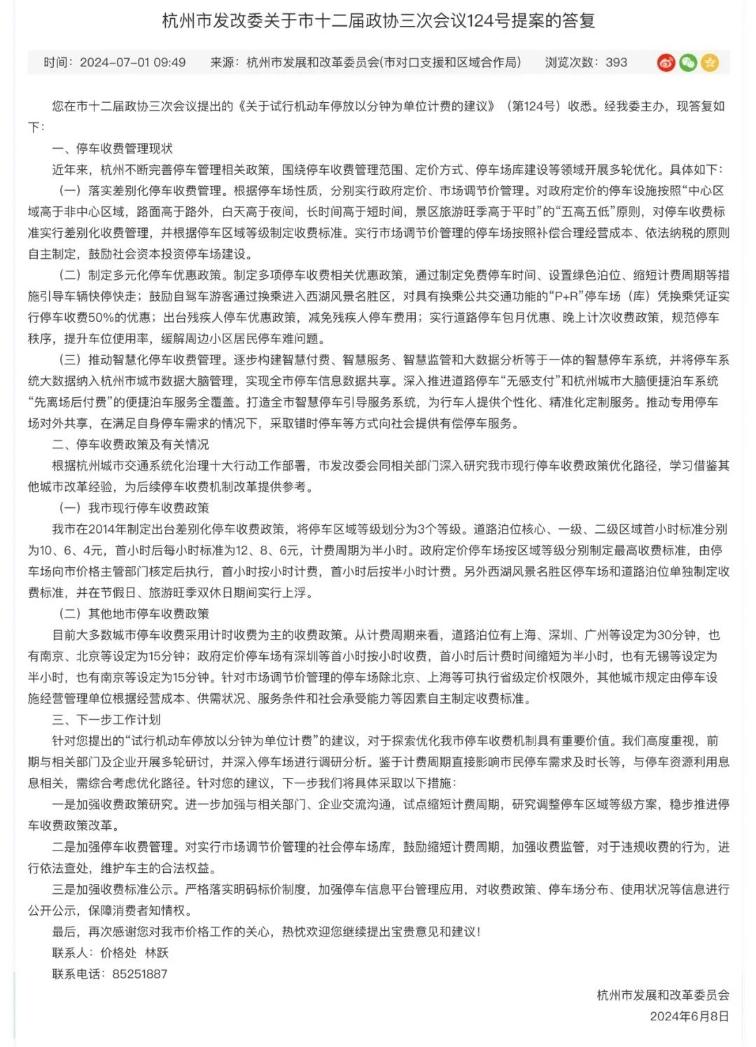 针对建议中提出的“试行机动车停放以分钟为单位计费”,杭州市发改委表示,该提议对于探索优化杭州市停车收费机制具有重要价值,并将探索停车收费机制改革的路径和可能性: