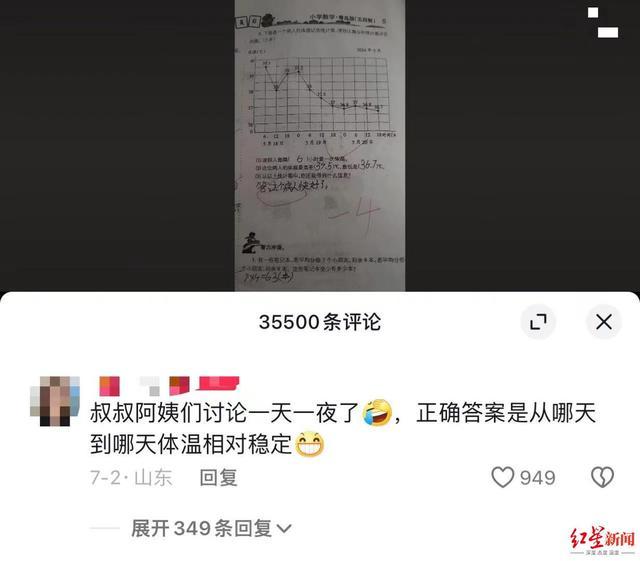 7月2日,分享该题的网友在评论区公布了“正确答案”——从哪天到哪天体温相对稳定。即使公布了“正确答案”,仍旧有很多网友表示无法理解孩子的原答案错在哪里。