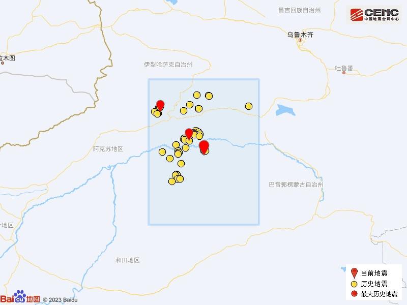 历史地震:根据中国地震台网速报目录,震中周边200公里内近5年来发生3级以上地震共345次,最大地震分别是2024年4月10日在新疆阿克苏地区拜城县发生的5.6级地震(距离本次震中185公里)和2020年1月16日在新疆阿克苏地区库车县发生的5.6级地震(距离本次震中63公里),按震级大小前50次历史地震分布如图。