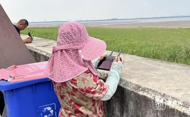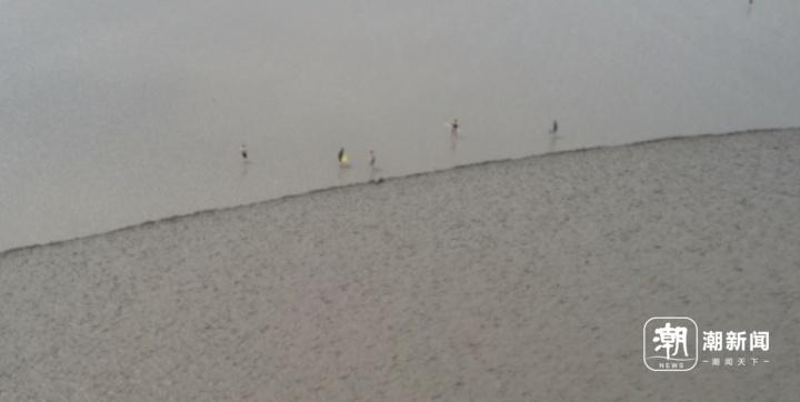 “就是在这里抢鱼的。”一名操作无人机拍摄的人说,他朋友就在滩涂上等着抢潮头鱼。
