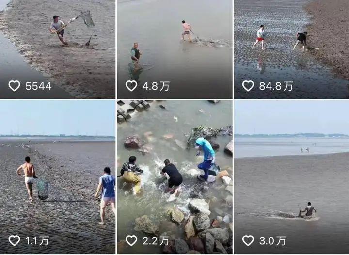 这些“抢潮头鱼”的视频,虽然加上了“抢潮头鱼危险,请勿模仿”,“不熟悉水性,没有弄潮经验的人,请勿尝试”等字样,但大多数视频配乐欢快,展现的都是满满渔获的画面。