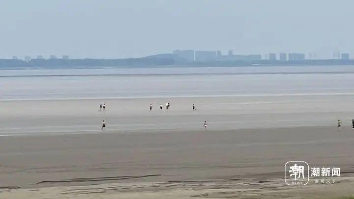 记者粗数了一下,有超过一百人在江堤滩涂之下。这些人中,不少到了滩涂的深处,有人已经到了距离江堤超过1公里的位置。