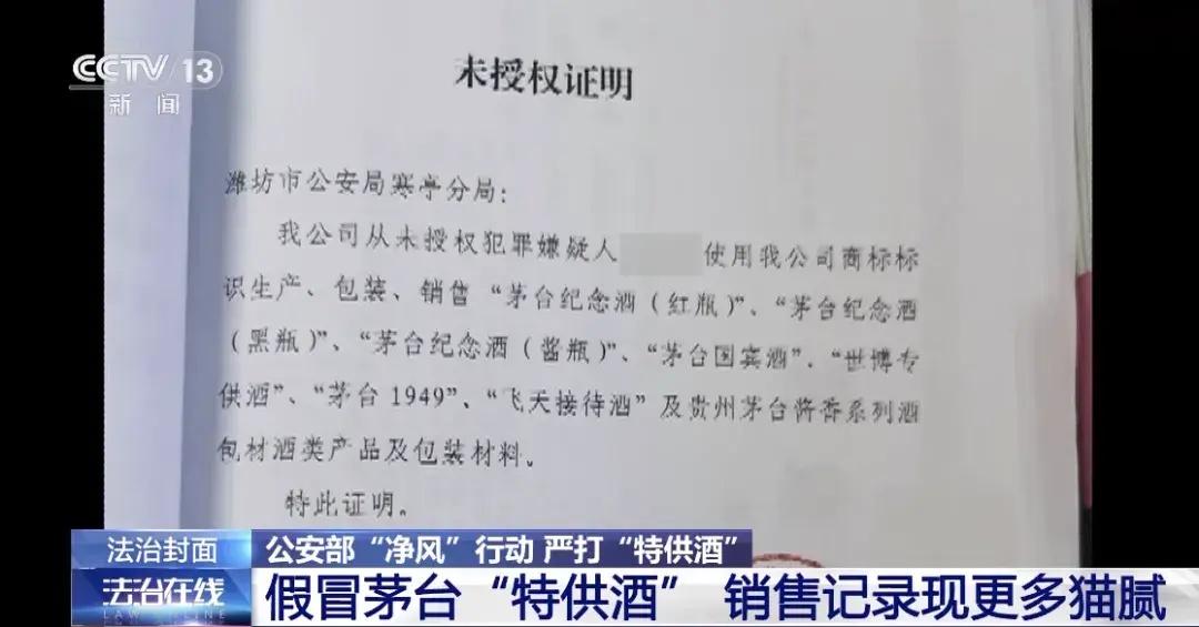 根据直播平台要求,如售卖某品牌商品,必须提供相关经营资质。但当警方和茅台厂家取得联系后得知,这两个网络直播间并未获得茅台酒厂授权,售卖的所谓"特供酒"根本不是产自茅台酒厂。