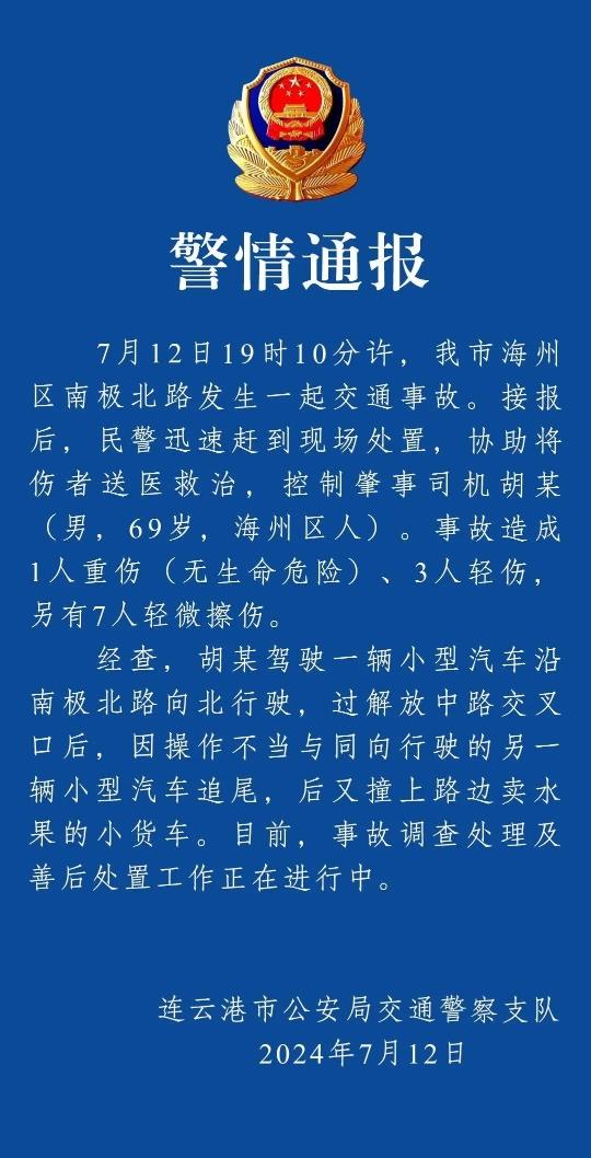连云港市公安局交通警察支队发布警情通报:7月12日19时10分许,我市海州区南极北路发生一起交通事故。接报后,民警迅速赶到现场处置,协助将伤者送医救治,控制肇事司机胡某(男,69岁,海州区人)。事故造成1人重伤(无生命危险)、3人轻伤,另有7人轻微擦伤。
