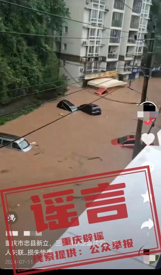 7月11日,某网民发布信息称“重庆市忠县新立、三汇洪水泛滥成灾,多人失联、损失惨重”。