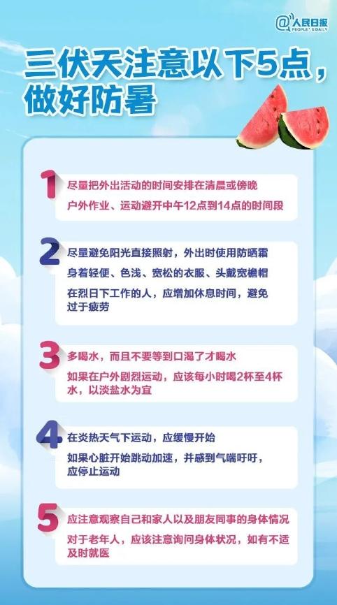 “三伏”大约在每年7月中旬到8月中下旬,正好处于小暑与处暑节气之间,天气最为炎热。入伏后一般以“桑拿天”为代表,公众一定要注意防暑降温。