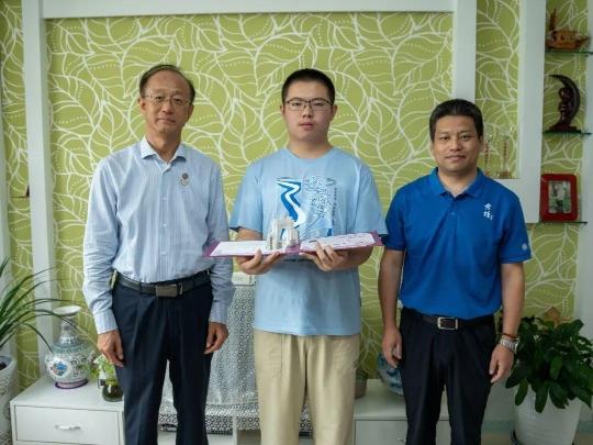 清华大学秀钟书院院长胡洪营教授(左),清华大学山西招生组组长岳东北(右)为和顺县第一中学杜劲辉(中)颁发清华大学录取通知书