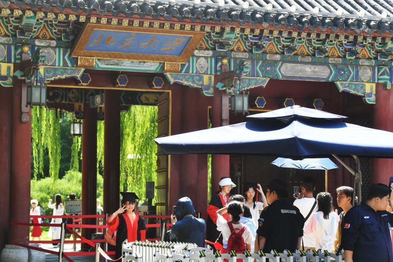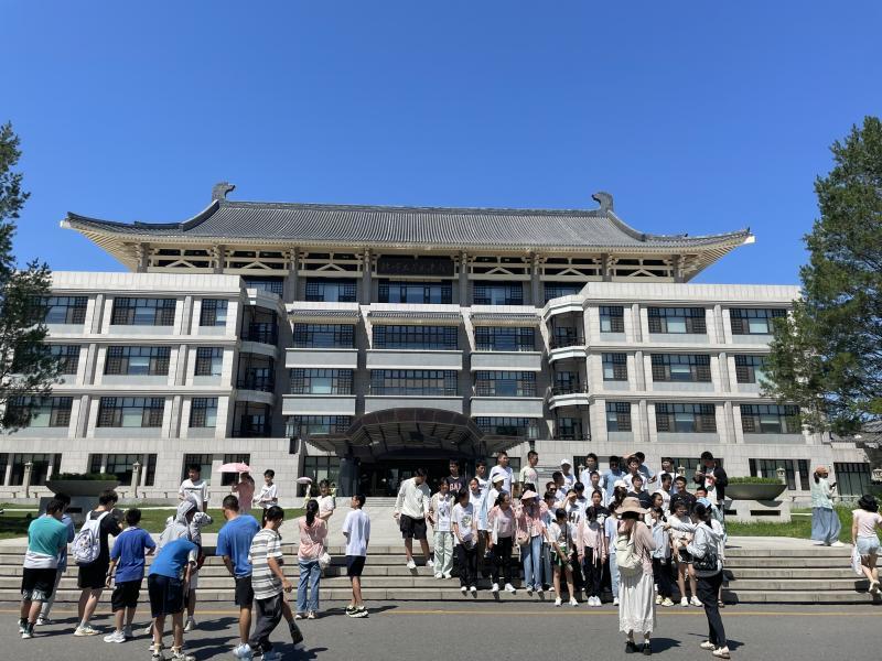 7月17日上午,北青报记者在北大图书馆门前看到,有研学团体正在合影留念,路边还坐着不少身着统一服装、挂着研学营证件的孩子。北青报记者了解到,当日有来自深圳、贵州、柳州等多地的研学团体前来北大参观,其中大多为初中或小学生,有的是学校组织的研学营,有的则是在校外机构报名。