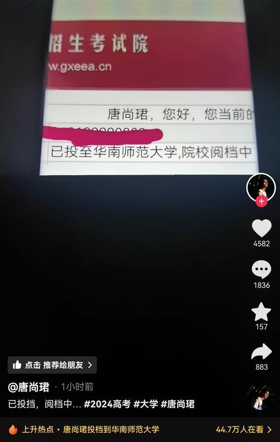 7月11日傍晚,唐尚珺发布“今日投档”视频。视频中,他举起篮球投向篮板,未中,称“希望不要像这样未中。”又投了一次球中了,称“希望像这样一样投中”。
