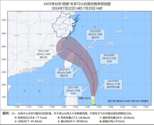 浙江省气象台7月22日16时发布的气象信息快报显示,今年第3号台风“格美”(强热带风暴级)22日14时其中心位于台湾省基隆市南偏东方向约870公里的洋面上,中心附近最大风力11级(30米/秒),中心最低气压980百帕,七级风圈半径200~220公里,十级风圈半径80~100公里。预计“格美”将以每小时10公里左右的速度向北偏西方向移动,强度逐渐增强,最强可达强台风或超强台风级(48~52米/秒,15~16级),并逐步向台湾岛东部海面靠近,24日夜里至25日上午登陆或擦过台湾北部,之后最大可能在浙江到福建中部一带沿海登陆。