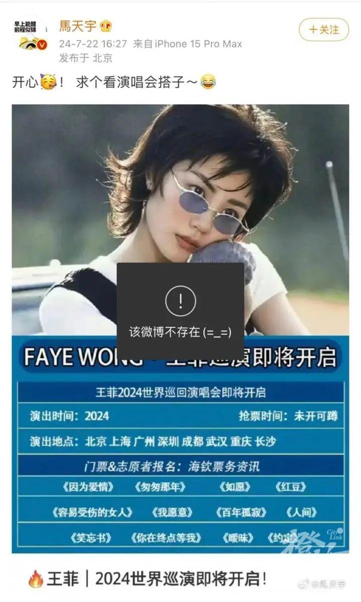 近日,“王菲演唱会”悄然登上热搜榜。22日,演员马天宇曾激动地发微博:“开心,求个看演唱会搭子”。