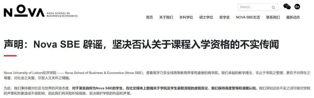 今年4月,葡萄牙新里斯本大学商业经济学院(Nova School of Business & Economics,下简称Nova SBE)在官网中文页面上发表声明称,“对于某些自称为Nova SBE的学生,在社交媒体上散播关于学院及学生录取流程的虚假言论,我们保持高度警惕和清醒认知。我们深知这些不实之词可能对学院的声誉和形象造成不良影响,因此我们将采取积极措施,坚决维护学院的利益和声誉。”