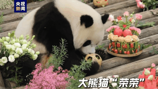 2022年出生的大熊猫“荣荣”迎来它2岁的生日。保育员为“荣荣”准备了一个用鲜花和西瓜、胡萝卜做成的生日蛋糕,并邀请“荣荣”的小伙伴“爱浜仔”为“荣荣”庆生。“荣荣”是一只可爱的雄性大熊猫,它的母亲是大熊猫“锦心”,父亲则是棕色大熊猫“七仔”。