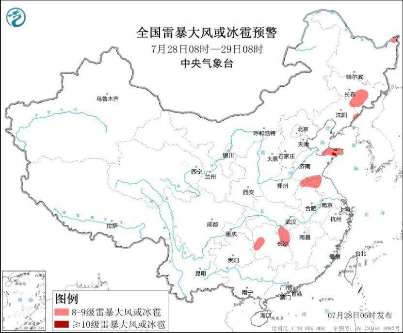 图2 全国雷暴大风或冰雹预警图(7月28日08时-29日08时)