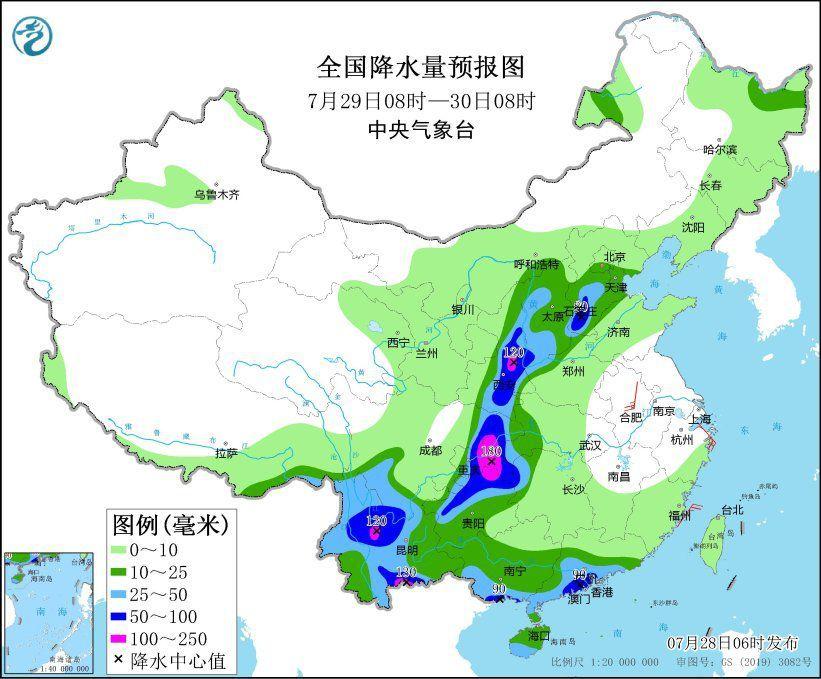 7月29日08时至30日08时,西北地区东部、华北大部、西南地区东部和南部、华南中南部等地有中到大雨,其中,陕西中南部、山西南部、河北南部、四川东部和西南部、重庆、贵州北部、云南中西部和东南部、广东和广西南部沿海等地的部分地区有暴雨,局地大暴雨(100~180毫米)(见图4)。内蒙古中部、辽东半岛、安徽中部、浙江东部等地的部分地区有4~6级风。