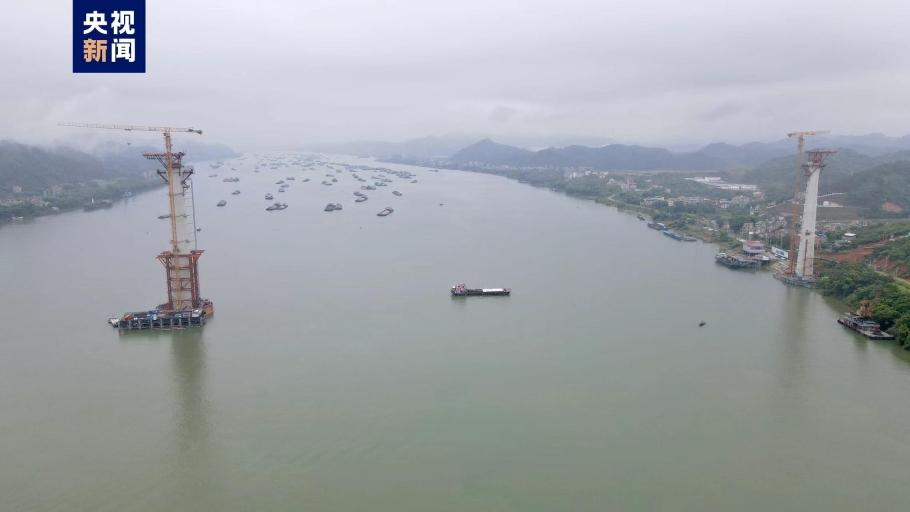 7月28日,在广西苍容浔江大桥施工现场,牵引船拽拉着先导索,从中塔分别牵引至南北边塔,三座主塔首次实现“牵手”。