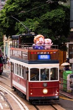 香港电车推出120周年庆祝活动,图为“麦兜与麦太”观光电车巡游。香港电车有限公司供图