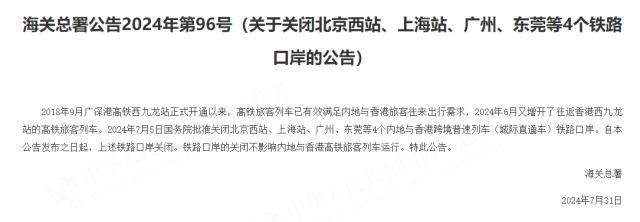 据海关总署消息,2018年9月广深港高铁西九龙站正式开通以来,高铁旅客列车已有效满足内地与香港旅客往来出行需求,2024年6月又增开了往返香港西九龙站的高铁旅客列车。2024年7月5日国务院批准关闭北京西站、上海站、广州、东莞等4个内地与香港跨境普速列车(城际直通车)铁路口岸。自本公告发布之日起,上述铁路口岸关闭。铁路口岸的关闭不影响内地与香港高铁旅客列车运行。特此公告。