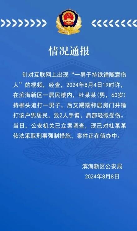 通报称,经查,2024年8月4日19时许,在滨海新区一居民楼内,杜某某(男,60岁)持榔头追打一男子,后又踢踹邻居房门并锤打该户男居民,致2人手臂、肩部轻微受伤。当日,公安机关已立案调查,现已对杜某某依法采取刑事强制措施,案件正在侦办中。