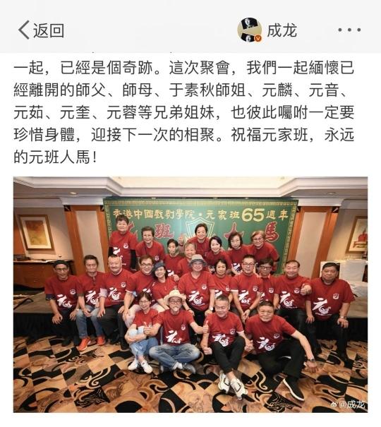 成龙在文中表示:“……我们这群人,从六七岁的时候就进入了于占元师父的香港中国戏剧学院……时光一过几十年,我们大家的脸上都有了不少皱纹,头发也花白了,很多动作也不能再轻易完成了,但是,正如洪金宝大哥说的那样,我们这群人,一辈子摔摔打打,上天入地,如今还能健健康康聚在一起,已经是个奇迹。这次聚会,我们一起缅怀已经离开的师父、师母、于素秋师姐、元麟、元音、元茹、元奎、元蓉等兄弟姐妹,也彼此嘱咐一定要珍惜身体,迎接下一次的相聚……”