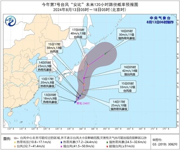 今年第7号台风“安比”(热带风暴级)的中心今天(13日)早晨5点钟位于日本东京南偏西方向约1330公里的洋面上,就是北纬23.9度、东经137.2度,中心附近最大风力有8级(18米/秒),中心最低气压为998百帕,七级风圈半径160-220公里。