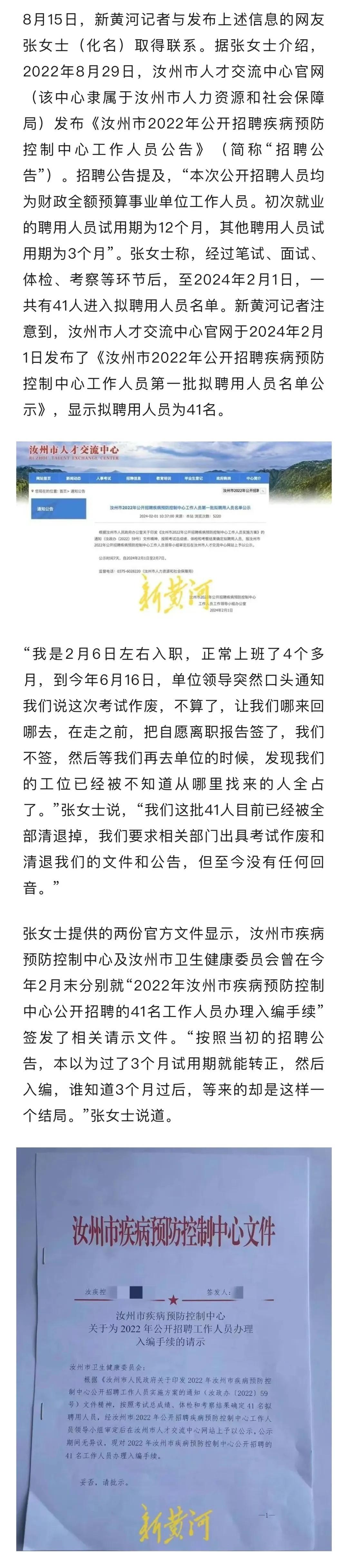 近日,有网友在社交平台发布信息称,包括其本人在内共计41名考生经笔试、面试、体检、考察后,于2024年2月初进入河南省汝州市疾病预防控制中心工作,没想到在入职4个多月后却接到单位领导“考试作废并要求其自愿离职”的口头通知,此事引发关注。