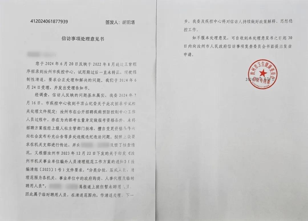 《意见书》中称,“您于2024年6月20日反映于2022年8月通过正常程序招录到汝州市疾控中心,试用期过后一直未转正,现被强制性清退,要求公正处理和解决问题。”“经调查,信访人反映的问题基本属实,我委2024年7月16日,市疾控中心收到平顶山纪委关于此次招录考试相关处理文件规定:汝州市在公开招聘疾病预防控制中心工作人员过程中,存在为内部考生量身定做报考资格条件,未将招聘方案报经上级人社主管部门批准,擅自变更资格条件未向社会发布补充公告等多处违规违纪违法问题。”