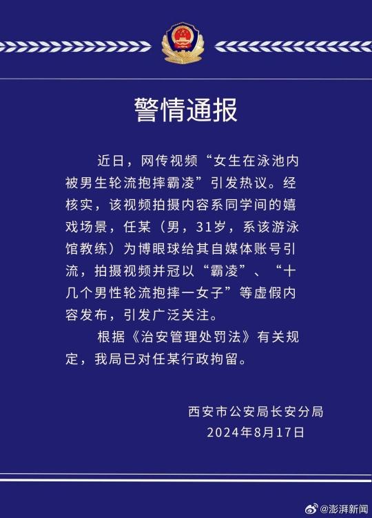 西安市公安局长安分局8月17日发布警情通报:近日,网传视频“女生在泳池内被男生轮流抱摔霸凌”引发热议。经核实,该视频拍摄内容系同学间的嬉戏场景,任某(男,31岁,系该游泳馆教练)为博眼球给其自媒体账号引流,拍摄视频并冠以“霸凌”“十几个男性轮流抱摔一女子”等虚假内容发布,引发广泛关注。