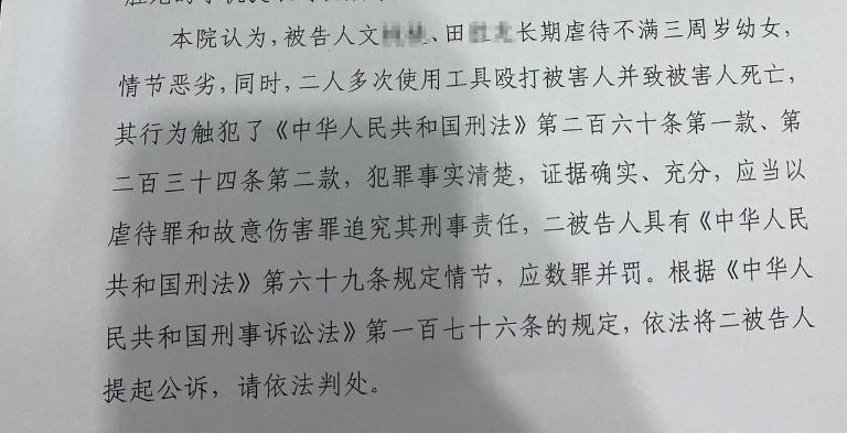起诉书显示,检方认为,被告人文某某、田某龙长期虐待不满三周岁幼女,情节恶劣,同时,二人多次使用工具殴打被害人并致被害人死亡,其行为应当以虐待罪和故意伤害罪追究其刑事责任,应数罪并罚。