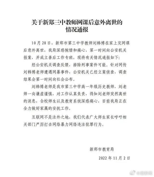 2022年11月2日,新郑市教育局针对此事发布情况通报称公安机关已立案侦查,调查结果会第一时间向社会公布。