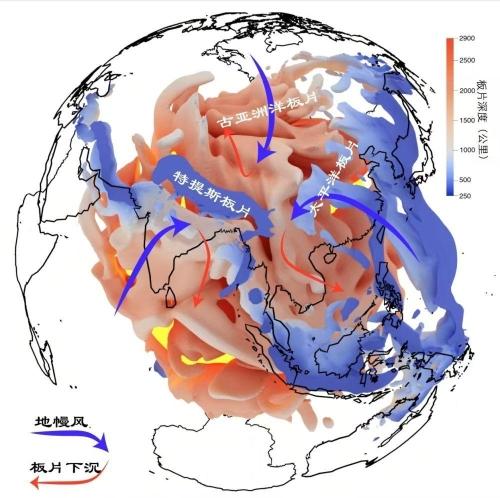 该项目研究团队进一步分析指出,前期俯冲的新特提斯洋板片和伊邪那岐—太平洋板片在沉入下地幔的过程中,对上地幔造成巨大横向压强变化,并在青藏高原下方形成一个低压中心,压强变化驱动着青藏高原周围的上地幔从远到近的汇聚,进而形成“地幔风”。