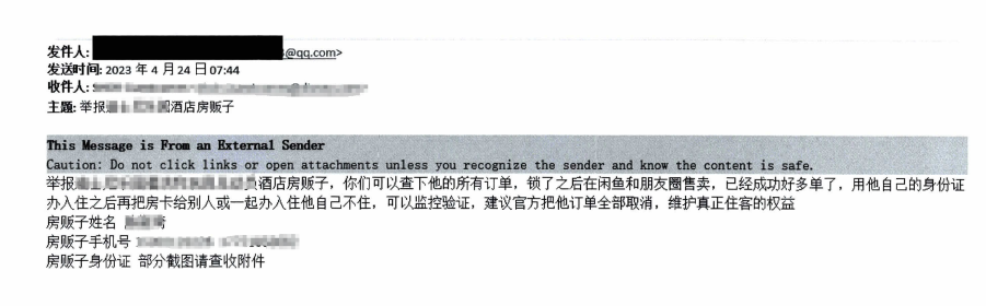 “举报主题乐园酒店房贩子”,2023年4月一家主题乐园收到了一封举报邮件。