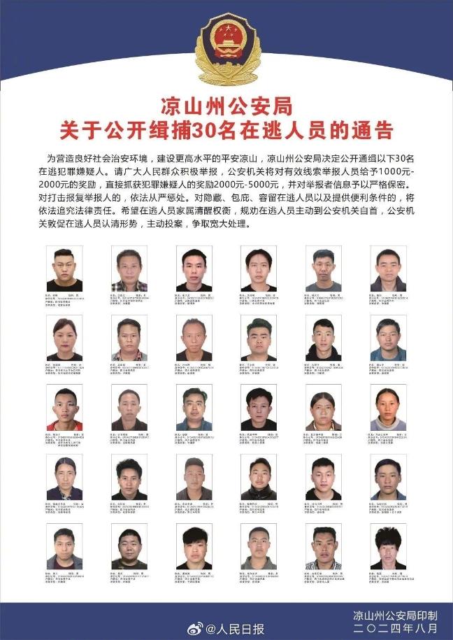 凉山公安公开通缉30名在逃犯罪嫌疑人。公安机关将对有效线索举报人员给予1000元—2000元的奖励,直接抓获犯罪嫌疑人的奖励2000元—5000元,并对举报者信息予以严格保密。对打击报复举报人的,依法从严惩处。对隐藏、包庇、容留在逃人员以及提供便利条件的,将依法追究法律责任。