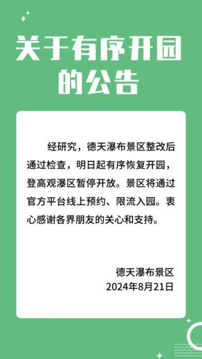中新网8月22日电 据“德天跨国瀑布”微信公众号消息,8月21日晚,广西崇左德天瀑布景区发布公告称,经研究,德天瀑布景区整改后通过检查,8月22日起有序恢复开园,登高观瀑区暂停开放。景区将通过官方平台线上预约,限流入园。