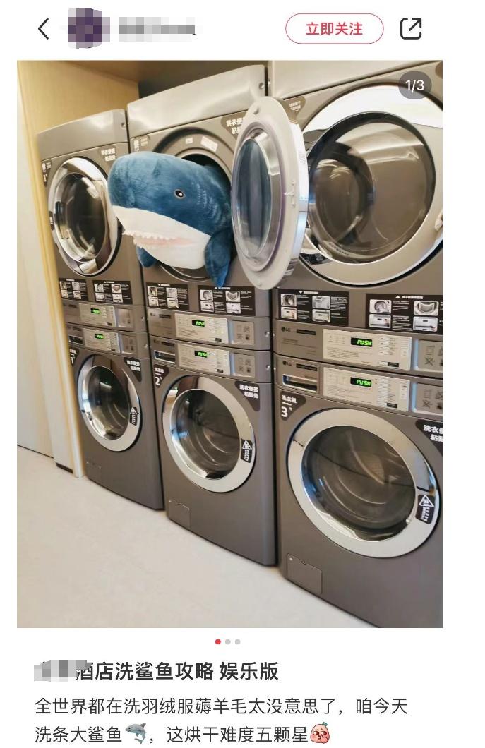 除了洗各色羽绒服,使用连锁酒店洗衣房的方案可谓花样百出。比如有网友带上巨大的鲨鱼公仔来洗。