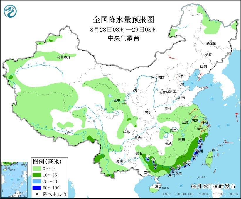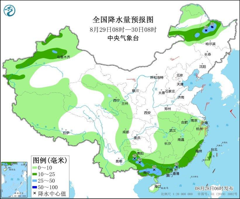 全国降水量预报图(8月28日08时-29日08时)。图片来源:中央气象台网站