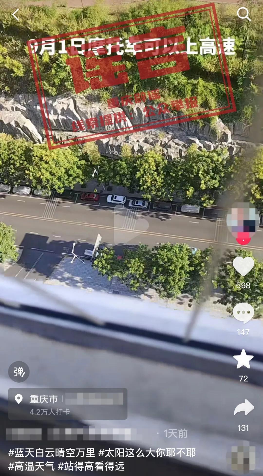 经核实,根据《重庆市公路管理条例》第三十一条规定:在高速公路、高速公路用地范围内,禁止非机动车、摩托车、拖拉机、轮式专用机械车、铁轮车、履带车和可能损害路面的机具行驶;第六十四条规定:在高速公路行驶摩托车或者随意上下乘客、装卸货物、停放车辆的,由公安机关交通管理部门责令停止违法行为,处警告或者二十元以上两百元以下罚款。目前,谣言线索已转交相关部门对造谣者进行进一步调查处置。