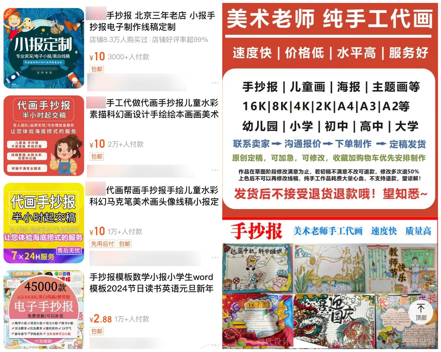 此外,网络上还有自动生成手抄报的小程序,家长可以根据主题调整版面,自动生成。传统模板如果还不能满足需求,手抄报“代画”业务也已经非常成熟。在某二手电商平台,一位自称多次为代画学生赢得奖项的卖家告诉记者,A4纸大小的手抄报,参与评奖收费60元,不评奖的,45元一张。