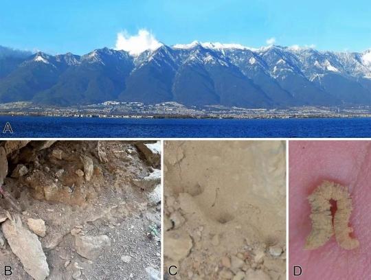 图2:苍山潜穴虻生境及生态图。A. 模式产地——大理苍山;B, C. 幼虫生境;D. 幼虫