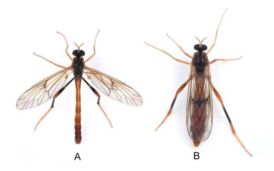图1:苍山潜穴虻。A. 雄性;B. 雌性