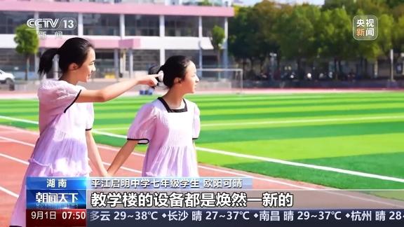 平江启明中学七年级学生 欧阳可晴:操场都是崭新的,教学楼的设备都是焕然一新的,整个学校给我的感觉就是整洁干净。