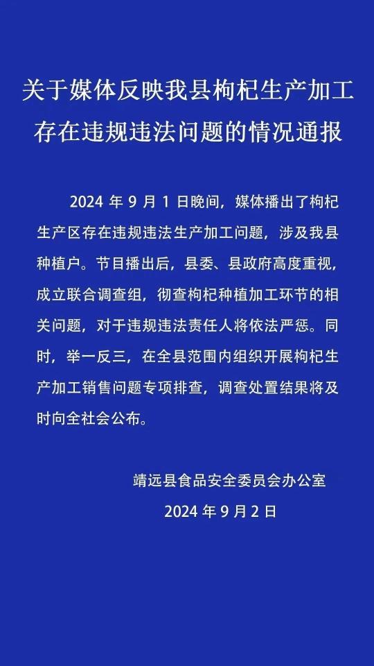 9月2日,甘肃省靖远县食品安全委员会办公室发布关于媒体反映该县枸杞生产加工存在违规违法问题的情况通报。全文如下: