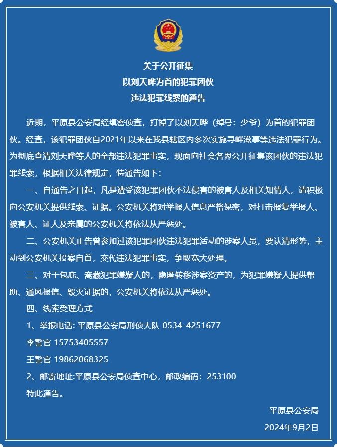 9月2日,山东德州平原县公安局发布关于公开征集以刘天晔为首的犯罪团伙违法犯罪线索的通告。