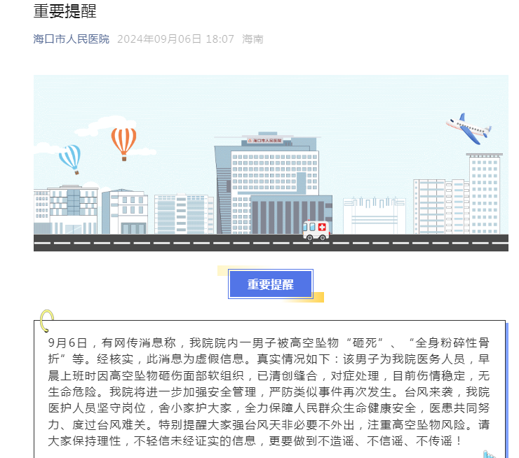 据海口市人民医院消息,9月6日,有网传消息称,该院院内一男子被高空坠物“砸死”、“全身粉碎性骨折”等。经核实,此消息为虚假信息。真实情况如下:该男子为该院医务人员,早晨上班时因高空坠物砸伤面部软组织,已清创缝合,对症处理,目前伤情稳定,无生命危险。该院将进一步加强安全管理,严防类似事件再次发生。