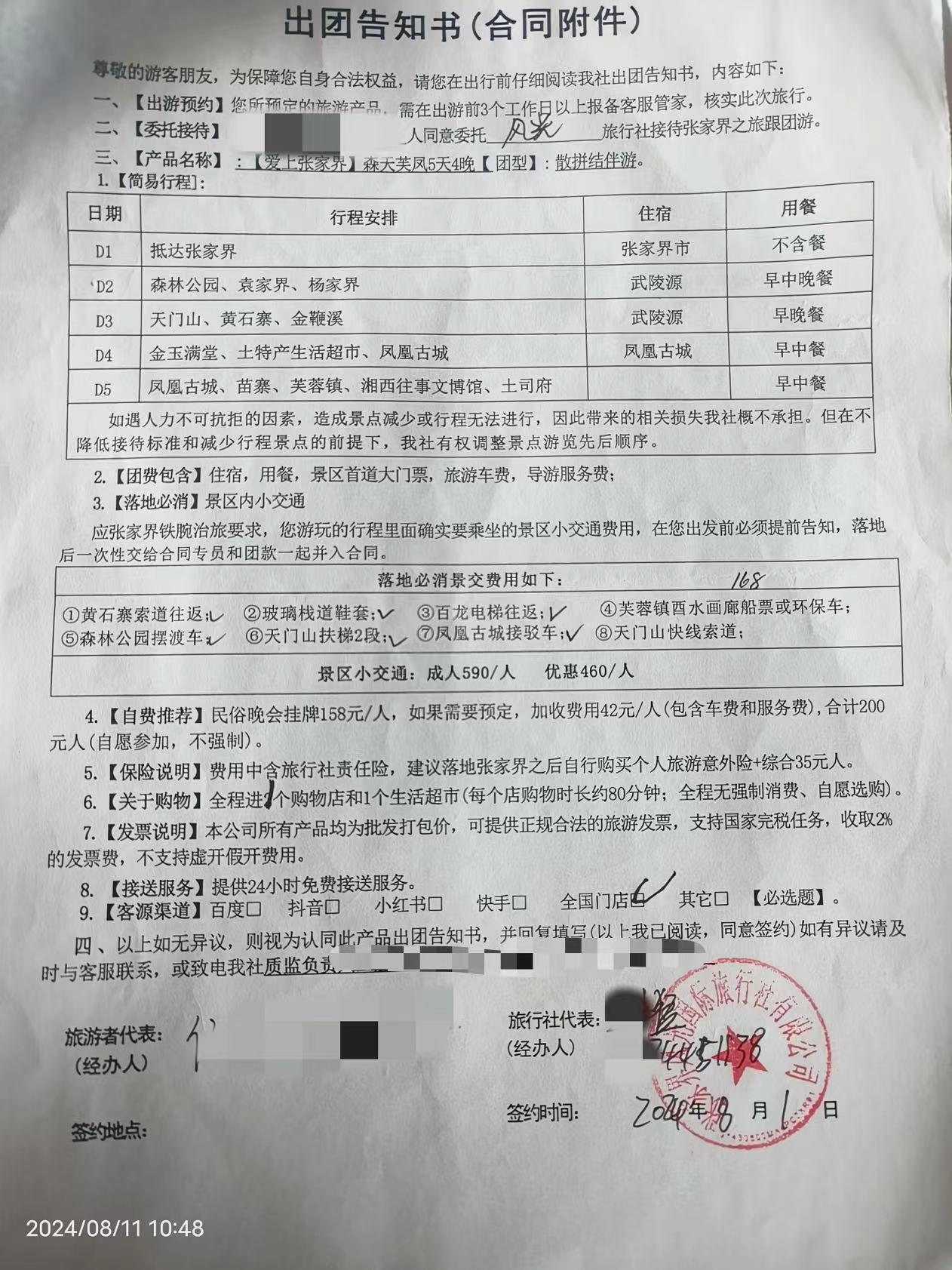 侯女士在张家界风光国际旅行社签订的出团告知书