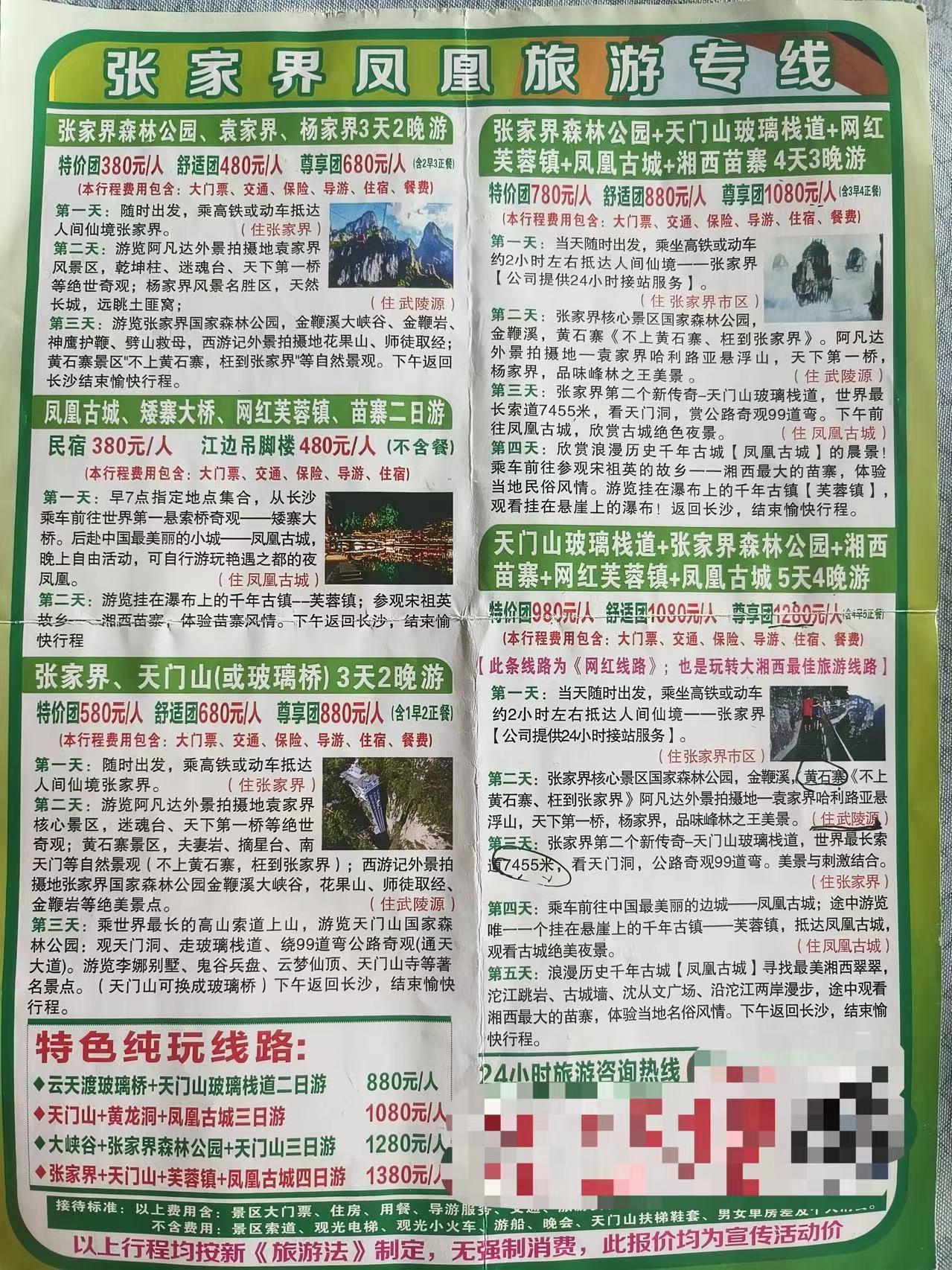 据侯女士回忆,7月31日,她在岳麓书院旅游时看到一位自称是“中国国际旅行社”导游的人,正在分发旅行宣传册。宣传册称,“天门山玻璃栈道+张家界森林公园+湘西苗寨+网红芙蓉镇+凤凰古城”的5天4夜游,8月1日开始至8月5日结束。出于好奇,侯女士向导游询问了旅行相关信息。