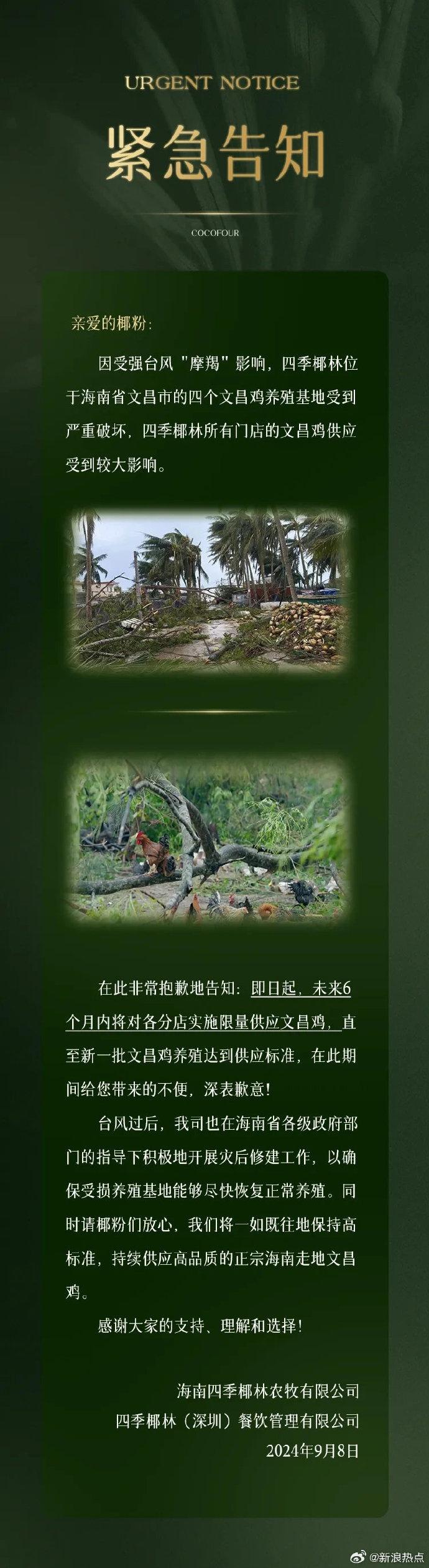 9月8日,连锁椰子鸡火锅品牌“四季椰林”发文称,受台风“摩羯”影响,其位于海南文昌的文昌鸡养殖基地损毁严重,未来半年门店将限量供应文昌鸡,直至新鸡达到供应标准;9月9日,另一家连锁椰子鸡火锅品牌“同仁四季”同样发文称,本批次文昌鸡虽然未遭到损失,但是短期内文昌鸡的供应可能会受到影响。
