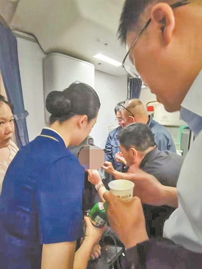 原来在飞行途中,一名男性乘客突然胸闷严重、呼吸急促、意识模糊,随后出现嘴唇干裂发紫、面色苍白,并发出断断续续的喘息声,于是家属紧急求助机组人员。