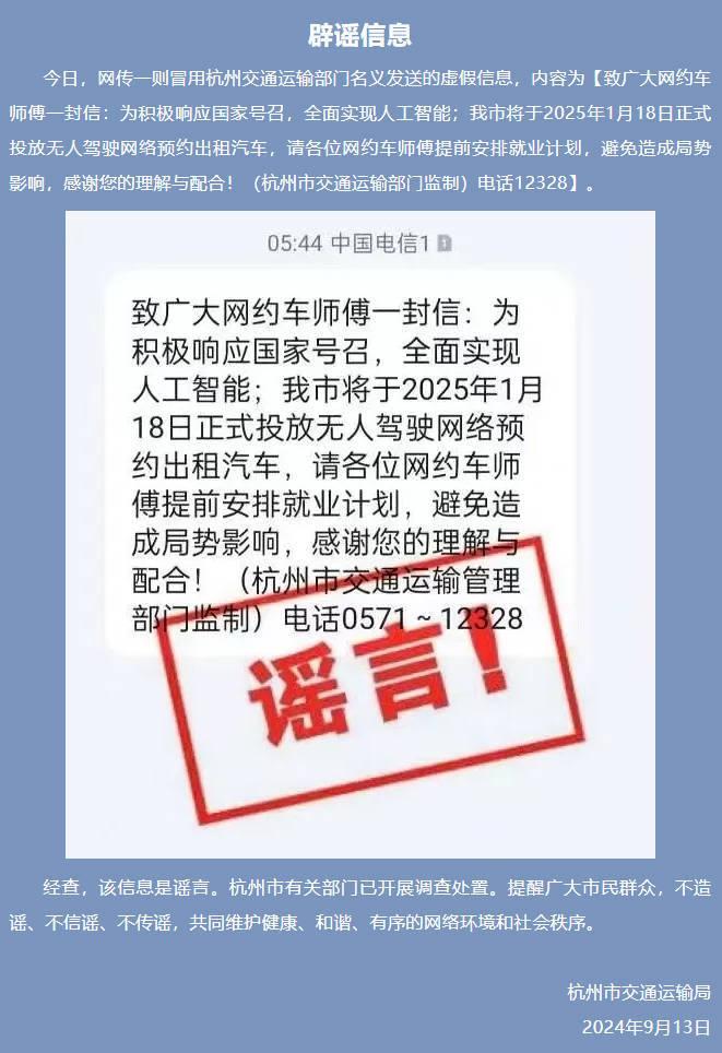 央视网消息:据“杭州交通”微信公众号消息,9月13日,一则冒用杭州交通运输部门名义发送的虚假信息内容为【致广大网约车师傅一封信:为积极响应国家号召,全面实现人工智能;我市将于2025年1月18日正式投放无人驾驶网络预约出租汽车,请各位网约车师傅提前安排就业计划,避免造成局势影响,感谢您的理解与配合!(杭州市交通运输部门监制)电话12328】。